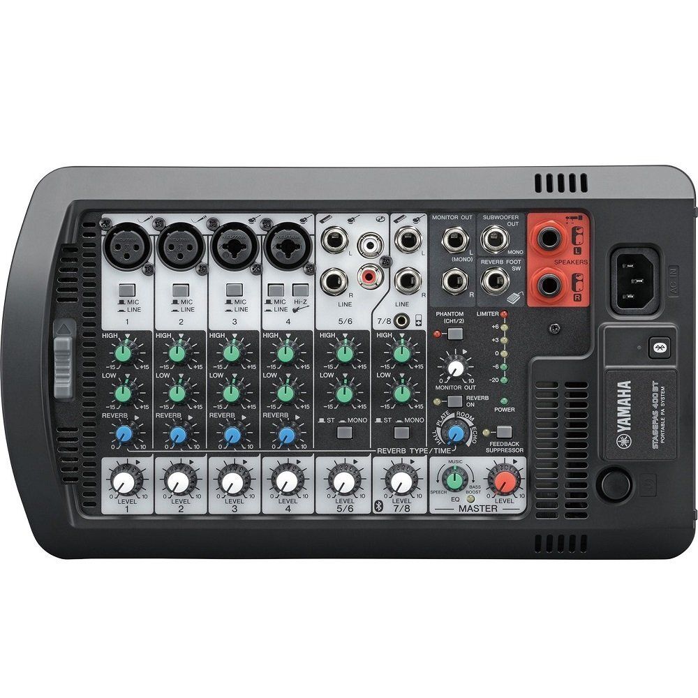Вбудований мікшер має 4 мікрофонні та 4 лінійні входи. Канали 3 і 4 обладнані універсальними комбінованими роз’ємами Neutric для під’єднання як XLR, так і 1/4″ джек кабелів. Крім цього, Stagepas 400BT обладнана входами з RCA і 3.5 мм міні-джек роз’ємами, що дають під’єднати практично будь-яке джерело аудіосигналу.